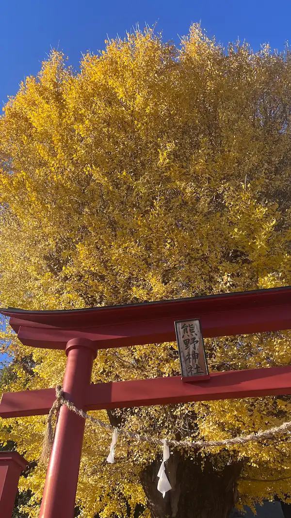 東中野熊野神社には、境内を象徴する御神木の公孫樹(イチョウ)がそびえています。秋になると葉が黄金色に色づき、参道を鮮やかに染め上げる姿は見事です。野猿街道沿いからはっきり見ることができます。地域の人々に親しまれてきたこの御神木は、訪れる人々に静かな安らぎを与えてくれます。